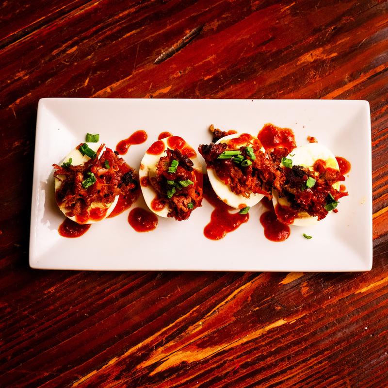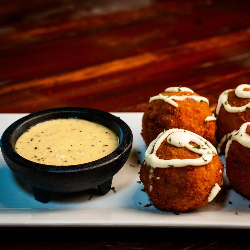 Brisket mac & cheese rolled in panko breadcrumbs. Served with Alabama white BBQ sauce