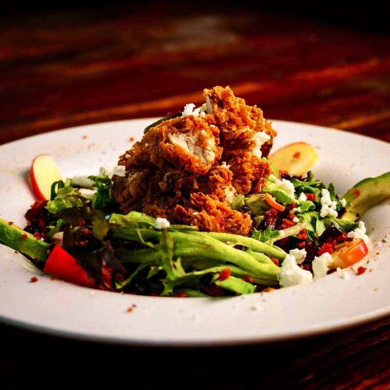 Spring mix, apples, craisins, avocado, goat cheese, bacon, hand breaded chicken strips