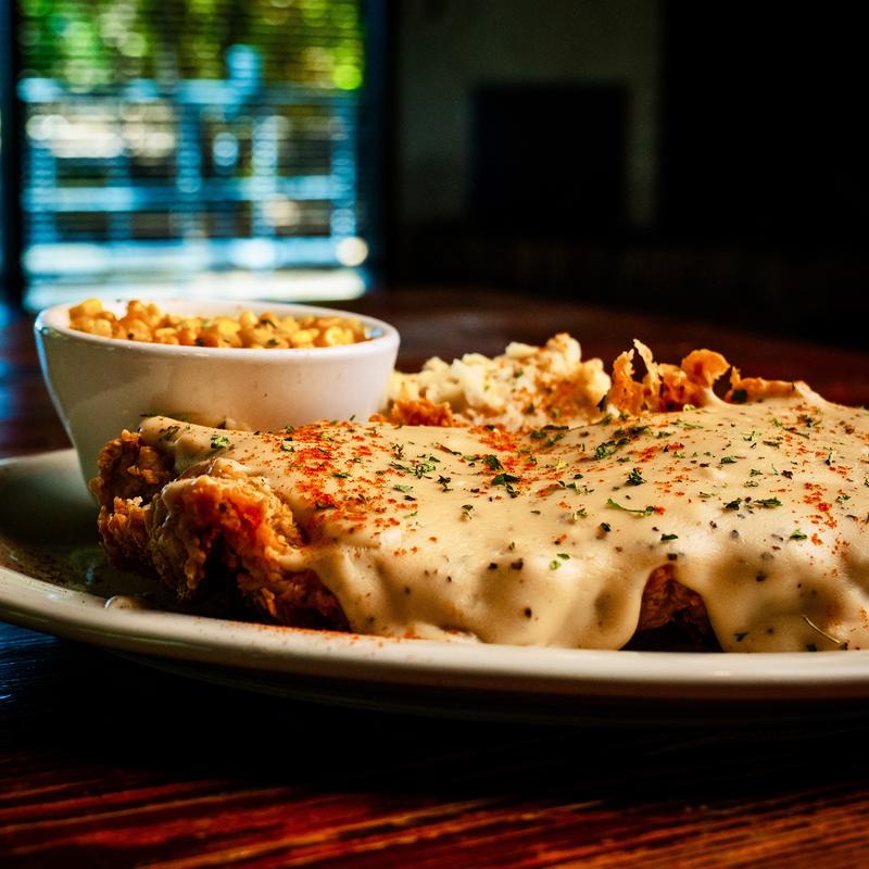 Hand breaded cube steak topped with house made cream gravy. Served with sautéed corn, garlic mashed potatoes & roll | Add red or green chile $1.49