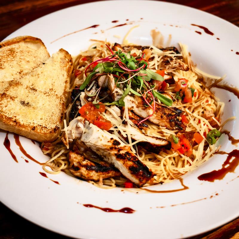 Grilled chicken breast, angel hair pasta, kumato bruschetta, parmesan cheese, balsamic glaze