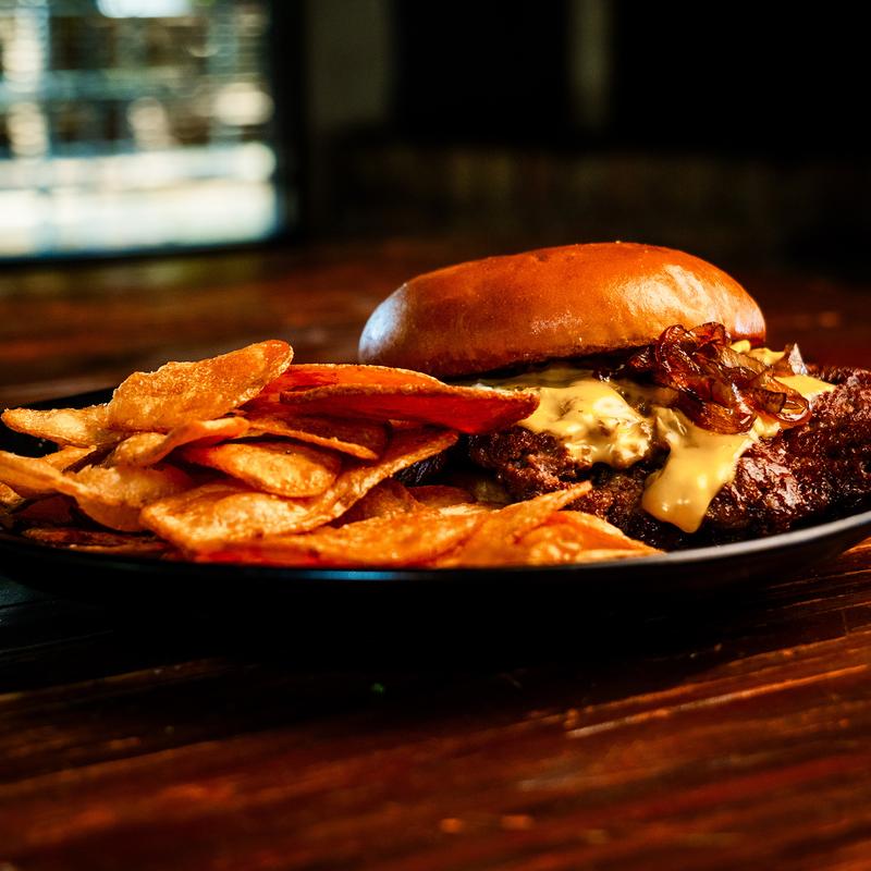 2- 1/4lb fresh ground beef patties, American cheese, caramelized onions, pickles, mayo, mustard, toasted bun