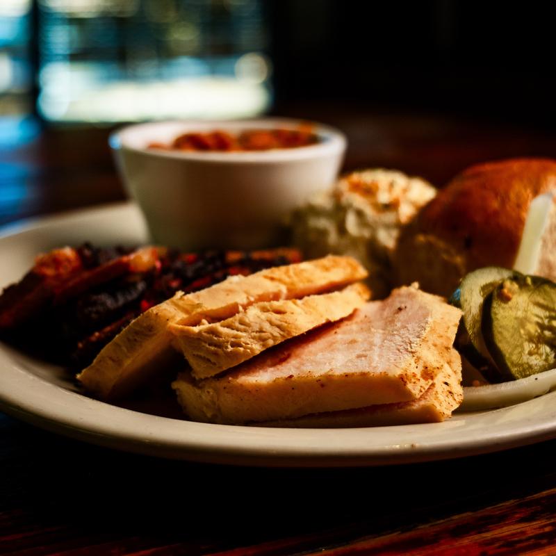 Choice of meat (sliced or chopped brisket, pulled pork, green chile cheddar sausage, turkey breast, chicken quarters, pork ribs) served with potato salad, pinto beans, pickles, onions & roll | Additional meats $4.49 each